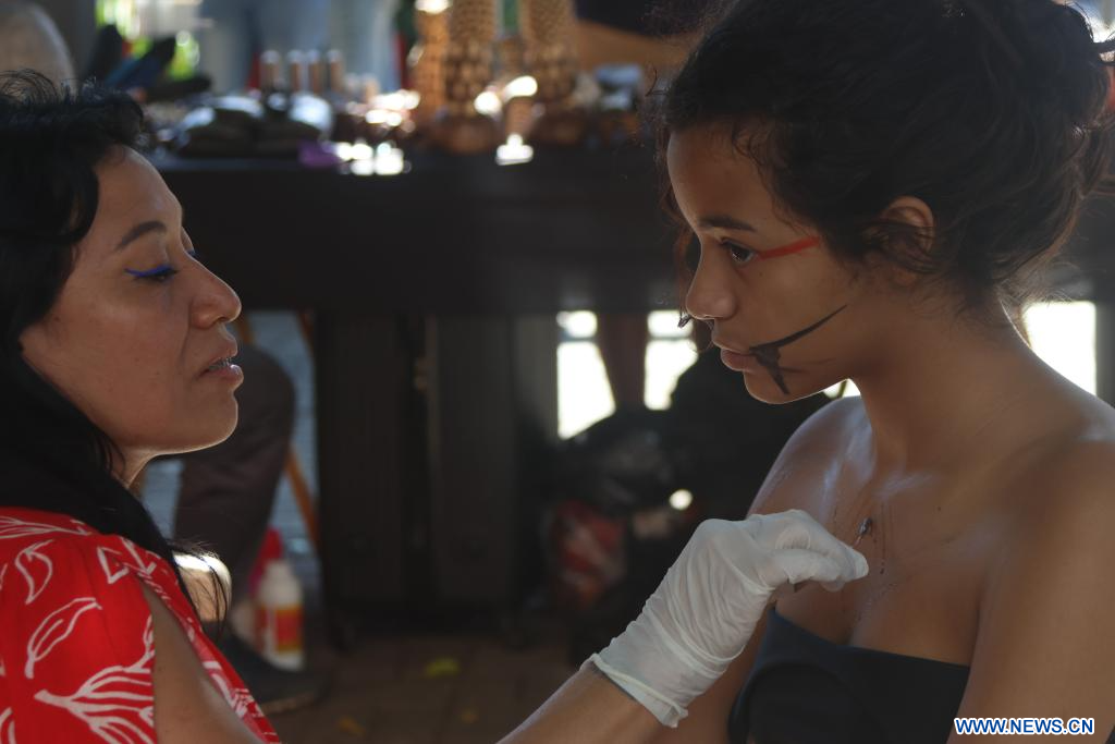 SAO PAULO, 19 abril, 2024 (Xinhua) -- Una joven mujer recibe pintura corporal en una feria que forma parte de las celebraciones del Día de los Pueblos Indígenas en el Museo de Culturas Indígenas, en Sao Paulo, Brasil, el 19 de abril de 2024. (Xinhua/Rahel Patrasso)