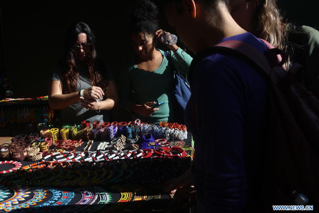 SAO PAULO, 19 abril, 2024 (Xinhua) -- Visitantes seleccionan artesanías que son exhibidas a la venta en una feria que forma parte de las celebraciones del Día de los Pueblos Indígenas en el Museo de Culturas Indígenas, en Sao Paulo, Brasil, el 19 de abril de 2024. (Xinhua/Rahel Patrasso)
