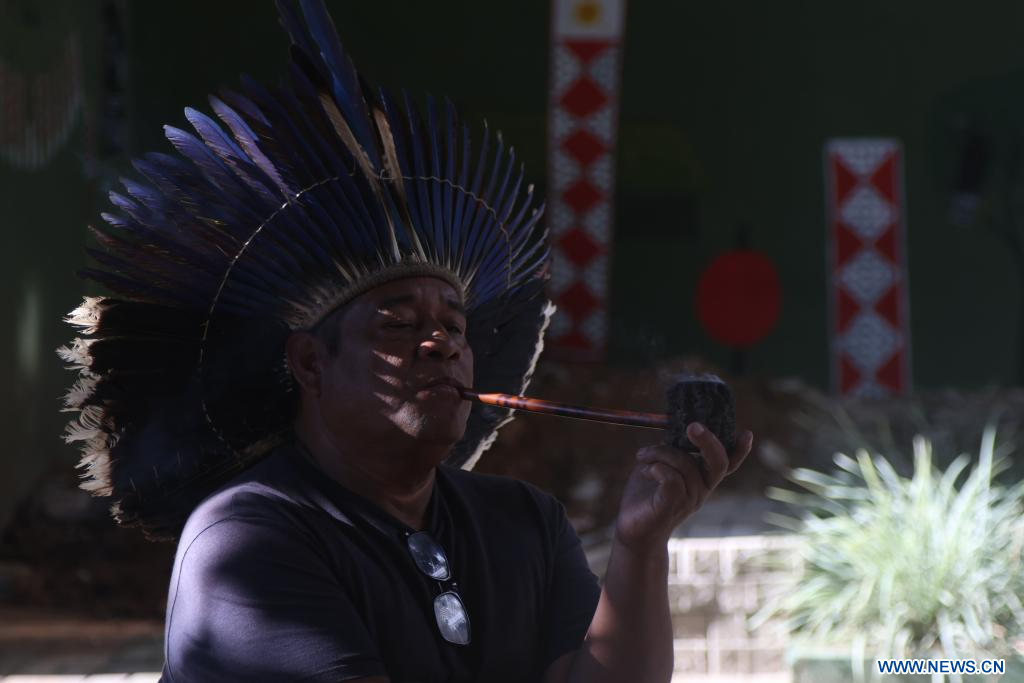 SAO PAULO, 19 abril, 2024 (Xinhua) -- Un hombre fuma en pipa en una feria que forma parte de las celebraciones del Día de los Pueblos Indígenas en el Museo de Culturas Indígenas, en Sao Paulo, Brasil, el 19 de abril de 2024. (Xinhua/Rahel Patrasso)