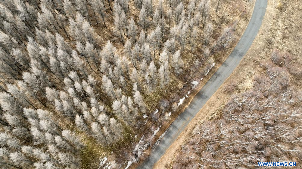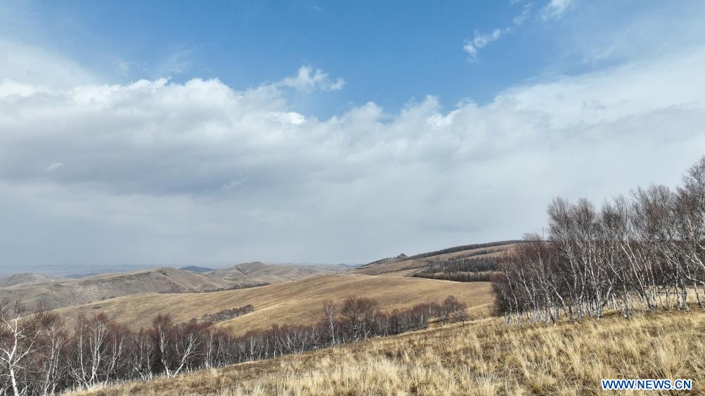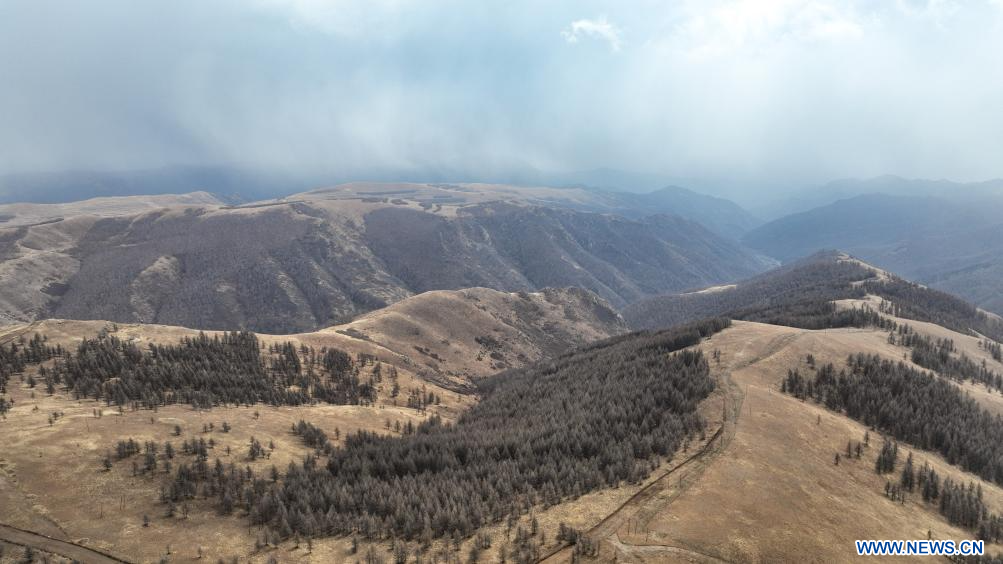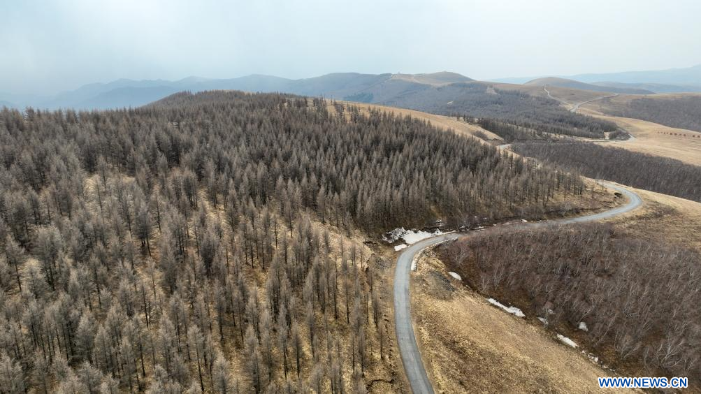 HOHHOT, 5 abril, 2024 (Xinhua) -- Imagen aérea tomada con un dron el 4 de abril de 2024 de una vista de la Reserva Natural de Daqingshan, en Hohhot, en la región autónoma de Mongolia Interior, en el norte de China. (Xinhua/Bei He)