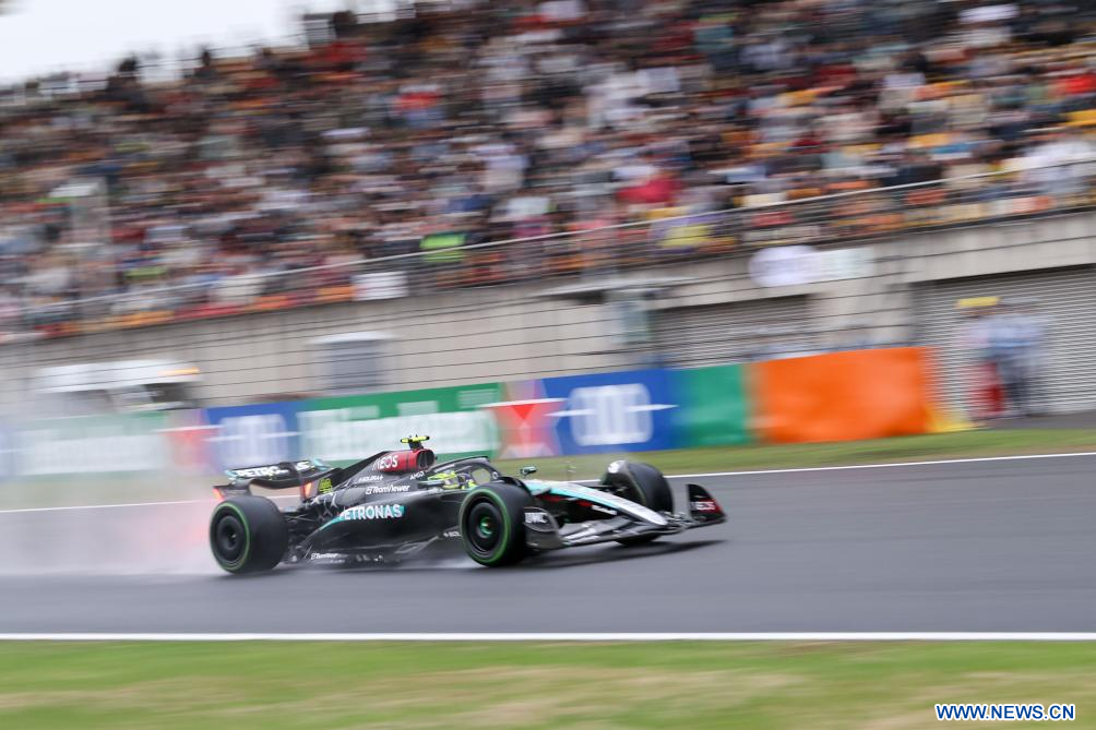 SHANGHAI, 19 abril, 2024 (Xinhua) -- El piloto británico de la escudería Mercedes, Lewis Hamilton, compite durante la primera sesión de prácticas del Gran Premio de China de Fórmula Uno, en el Circuito Internacional de Shanghai, en Shanghai, en el este de China, el 19 de abril de 2024. (Xinhua/Xia Yifang)