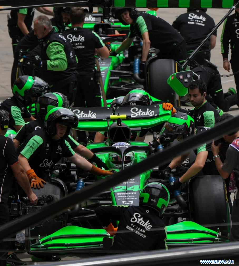 SHANGHAI, 19 abril, 2024 (Xinhua) -- Mecánicos de la escudería Kick Sauber trabajan en el vehículo del piloto chino, Zhou Guanyu, previo a la primera sesión de prácticas del Gran Premio de China de Fórmula 1, en el Circuito Internacional de Shanghai, en Shanghai, en el este de China, el 19 de abril de 2024. (Xinhua/He Changshan)