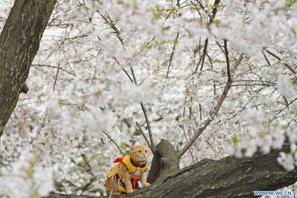 NUEVA YORK, 7 abril, 2024 (Xinhua) -- Imagen del 6 de abril de 2024 de un gato visto sobre una rama de un cerezo en Central Park, en Nueva York, Estados Unidos. (Xinhua/Li Rui)
