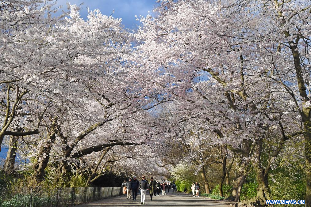 NUEVA YORK, 7 abril, 2024 (Xinhua) -- Imagen del 6 de abril de 2024 de personas caminando bajo flores de cerezo en Central Park, en Nueva York, Estados Unidos. (Xinhua/Li Rui)