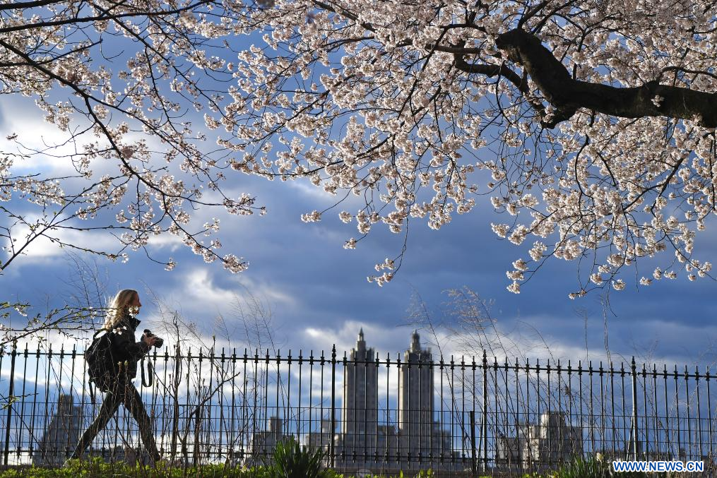 NUEVA YORK, 7 abril, 2024 (Xinhua) -- Imagen del 6 de abril de 2024 de una mujer caminando frente a flores de cerezo en Central Park, en Nueva York, Estados Unidos. (Xinhua/Li Rui)