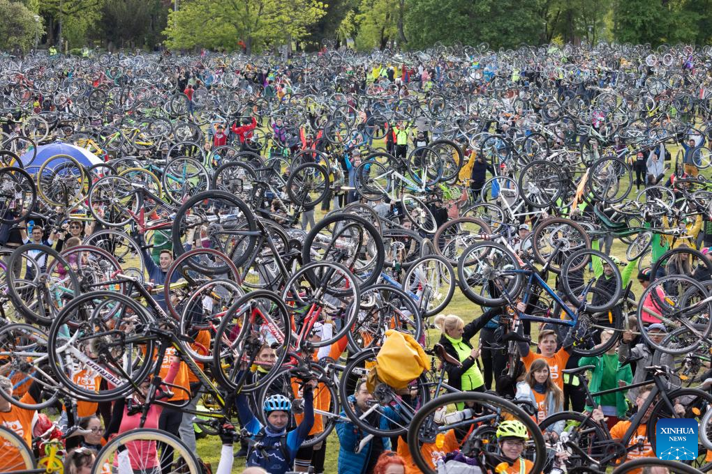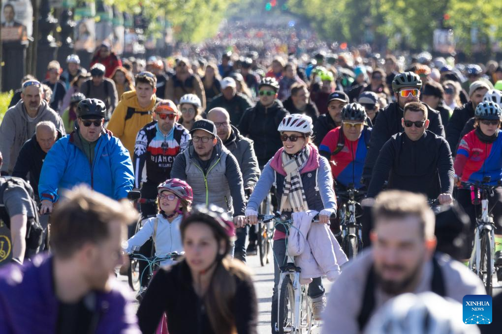 BUDAPEST, 21 abril, 2024 (Xinhua) -- Imagen del 20 de abril de 2024 de personas participando en el desfile ciclista "I Bike Budapest" para celebrar el Día de la Tierra, en Budapest, Hungría. (Xinhua/Attila Volgyi)