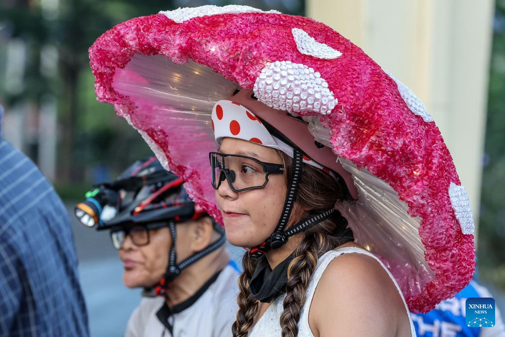 CIUDAD DE QUEZON, 21 abril, 2024 (Xinhua) -- Una mujer con un sombrero hecho con materiales reciclados participa en un evento en celebración del Día de la Tierra, en la Ciudad de Quezon, Filipinas, el 21 de abril de 2024. (Xinhua/Rouelle Umali)