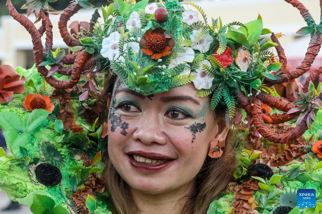 CIUDAD DE QUEZON, 21 abril, 2024 (Xinhua) -- Una mujer con un disfraz elaborado con materiales reciclados participa en un evento en celebración del Día de la Tierra, en la Ciudad de Quezon, Filipinas, el 21 de abril de 2024. (Xinhua/Rouelle Umali)