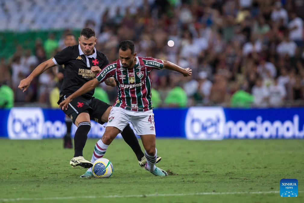 RIO DE JANEIRO, 21 abril, 2024 (Xinhua) -- Imagen del 20 de abril de 2024 del jugador Lima (d), de Fluminense, disputando el balón con Hugo Moura (i), de Vasco da Gama, durante el partido correspondiente a la jornada 3 del Campeonato Brasileño Serie A, celebrado en el Estadio Maracaná, en Río de Janeiro, Brasil. (Xinhua/Claudia Martini)