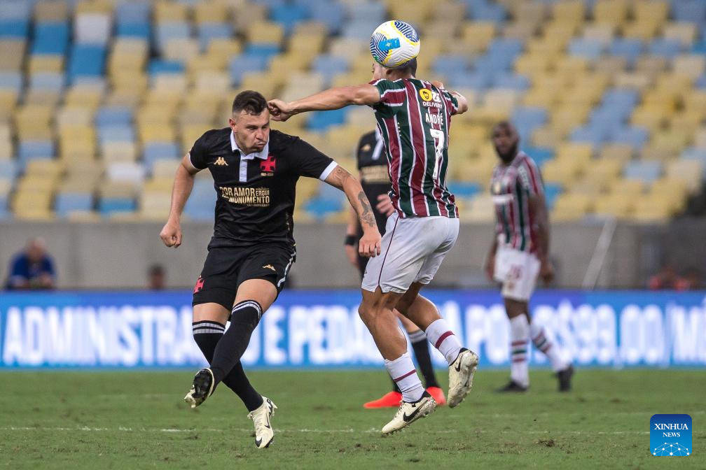 RIO DE JANEIRO, 21 abril, 2024 (Xinhua) -- Imagen del 20 de abril de 2024 del jugador André (d), de Fluminense, cabeceando el balón durante el partido correspondiente a la jornada 3 del Campeonato Brasileño Serie A, ante Vasco da Gama, celebrado en el Estadio Maracaná, en Río de Janeiro, Brasil. (Xinhua/Claudia Martini)