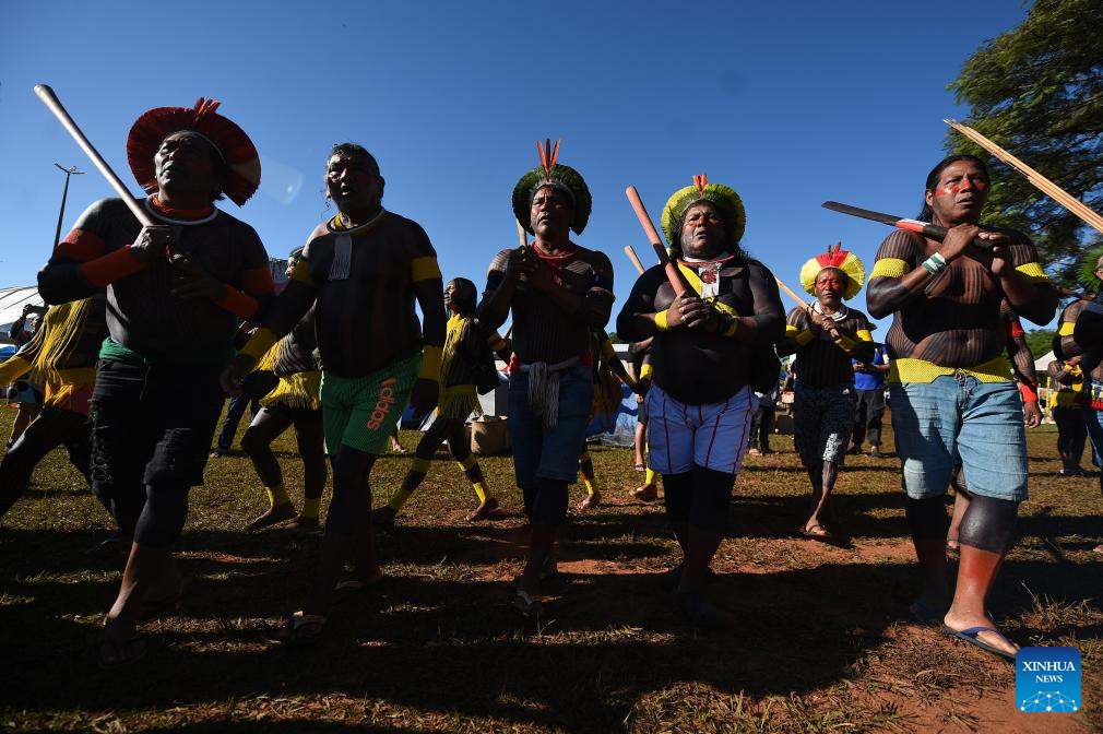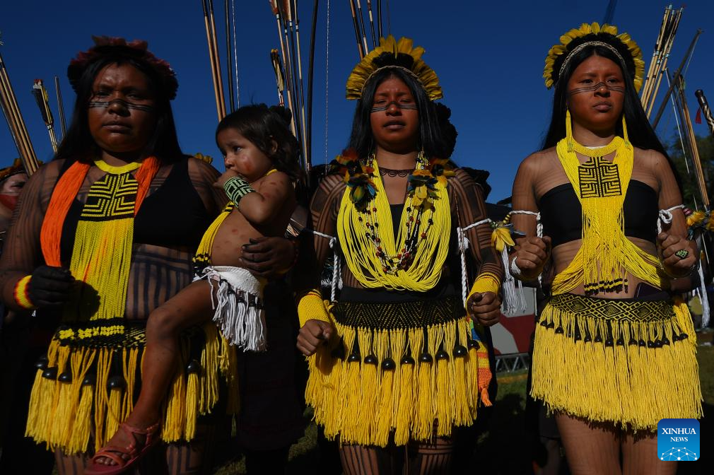 BRASILIA, 22 abril, 2024 (Xinhua) -- Mujeres del grupo indígena Kisedje, bailan durante el campamento Tierra Libre, un campamento de protesta para exigir la demarcación de tierras y defender los derechos culturales, en Brasilia, Brasil, el 22 de abril de 2024. (Xinhua/Lucio Tavora)