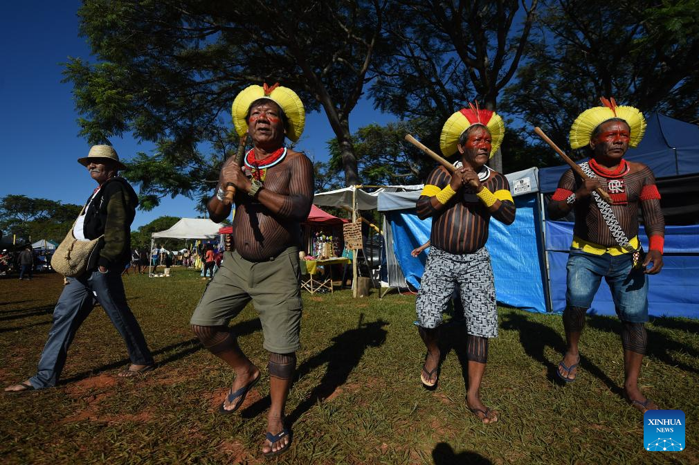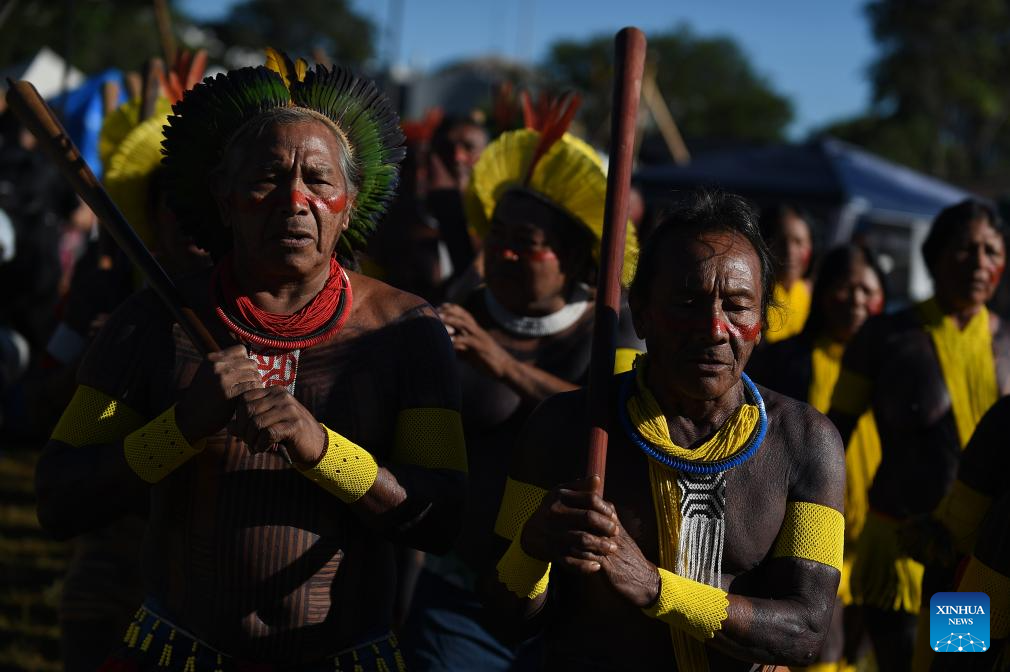 BRASILIA, 22 abril, 2024 (Xinhua) -- Hombres del grupo indígena Kayapo, asisten al campamento Tierra Libre, un campamento de protesta para exigir la demarcación de tierras y defender los derechos culturales, en Brasilia, Brasil, el 22 de abril de 2024. (Xinhua/Lucio Tavora)
