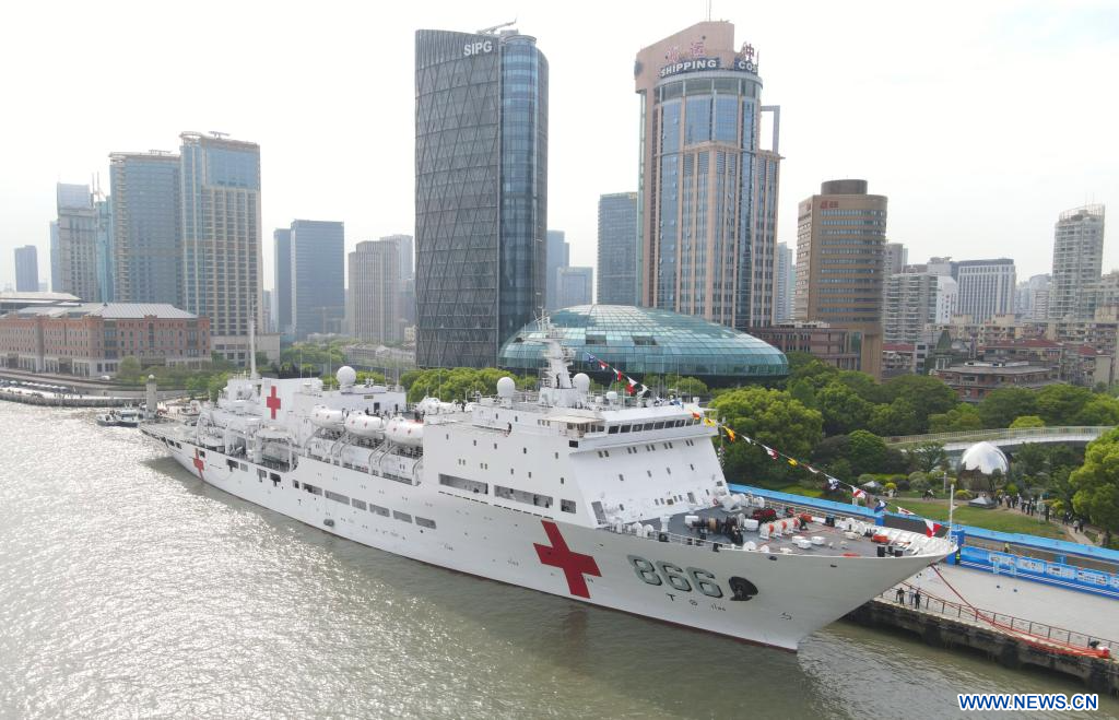 SHANGHAI, 23 abril, 2024 (Xinhua) -- Imagen aérea tomada con un dron el 22 de abril de 2024 del buque hospital "Arca de la Paz" atracado en un puerto, en Shanghai, en el este de China. La Armada del Ejército Popular de Liberación de China celebró eventos de jornadas de puertas abiertas en Shanghai el martes para conmemorar el 75º aniversario de su fundación. Los visitantes pudieron recorrer el destructor de misiles teledirigidos Zibo y el buque hospital "Arca de la Paz" en el evento. (Xinhua/Fang Zhe)