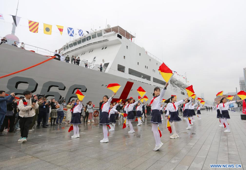 SHANGHAI, 23 abril, 2024 (Xinhua) -- Estudiantes realizan una presentación durante un evento de jornada de puertas abiertas en un puerto, en Shanghai, en el este de China, el 23 de abril de 2024. La Armada del Ejército Popular de Liberación de China celebró eventos de jornadas de puertas abiertas en Shanghai el martes para conmemorar el 75º aniversario de su fundación. Los visitantes pudieron recorrer el destructor de misiles teledirigidos Zibo y el buque hospital "Arca de la Paz" en el evento. (Xinhua/Fang Zhe)