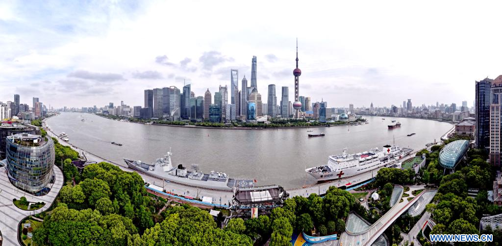 SHANGHAI, 23 abril, 2024 (Xinhua) -- Imagen aérea tomada con un dron el 22 de abril de 2024 del destructor de misiles teledirigidos Zibo (i) y el buque hospital "Arca de la Paz" (d) atracados en un puerto, en Shanghai, en el este de China. La Armada del Ejército Popular de Liberación de China celebró eventos de jornadas de puertas abiertas en Shanghai el martes para conmemorar el 75º aniversario de su fundación. Los visitantes pudieron recorrer el destructor de misiles teledirigidos Zibo y el buque hospital "Arca de la Paz" en el evento. (Xinhua/Fang Zhe)