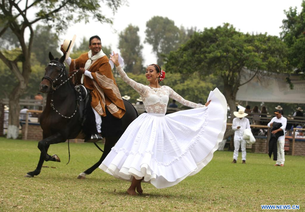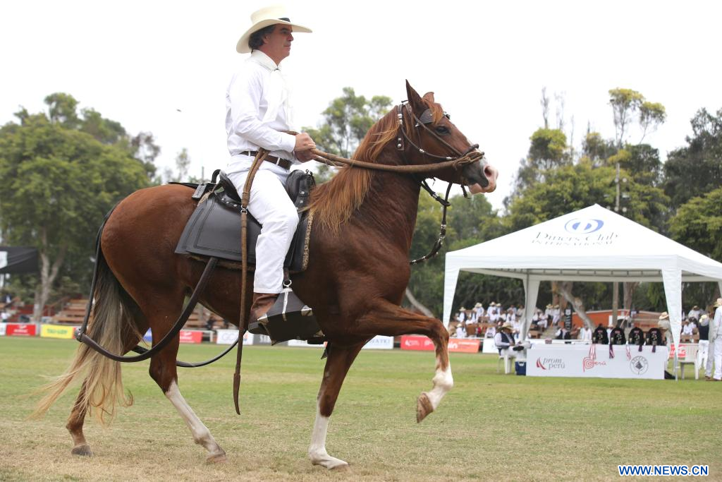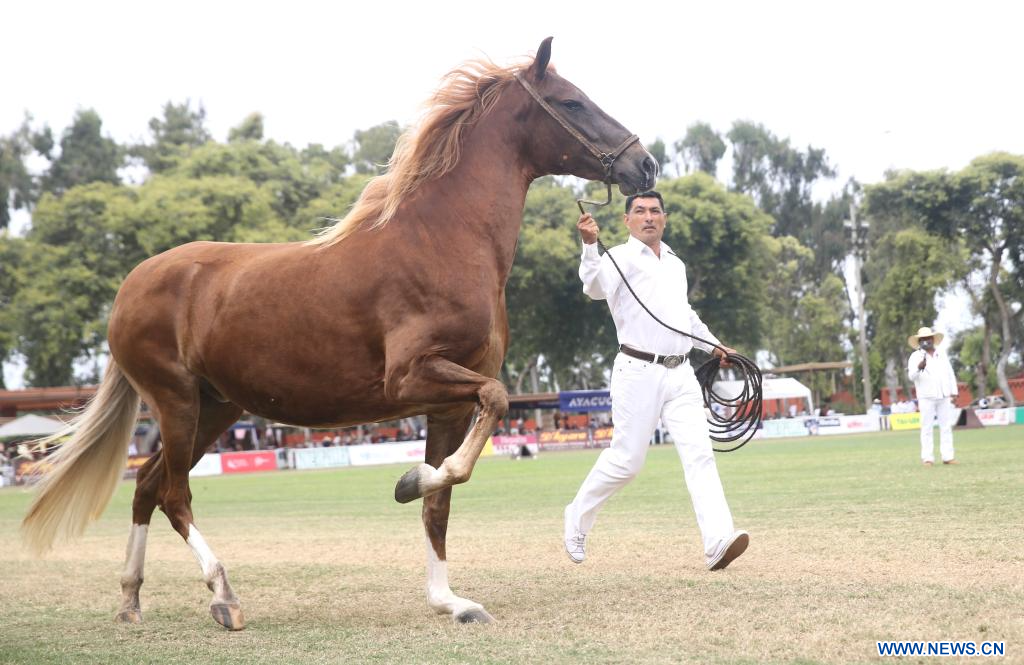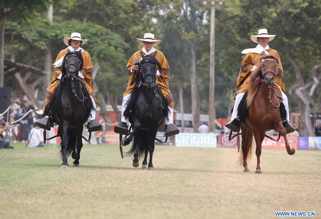 LIMA, 19 abril, 2024 (Xinhua) -- Jinetes montan caballos peruanos de paso mientras participan en el Concurso Nacional del Caballo Peruano de Paso en el Fundo Mamacona, en el distrito de Lurín, en el sur de Lima, Perú, el 19 de abril de 2024. (Xinhua/Mariana Bazo)