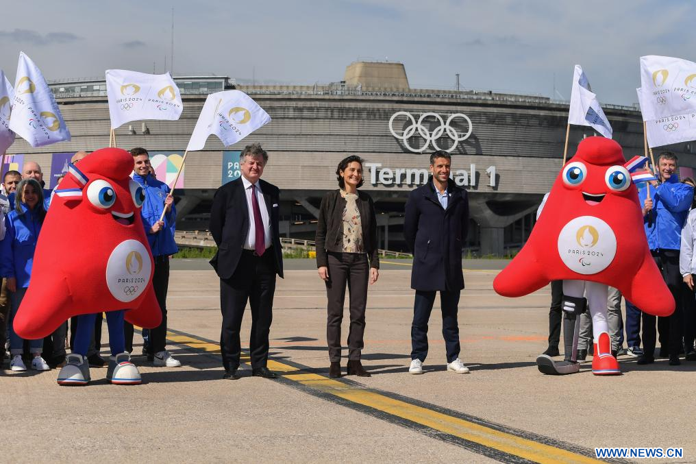 PARÍS, 24 abril, 2024 (Xinhua) -- Imagen del 23 de abril de 2024 del director general del grupo de aeropuertos de París Groupe ADP, Augustin de Romanet de Beaune (i), la ministra de Deportes francesa, Amelie Oudea-Castera (c), y el presidente del Comité Organizador de los Juegos Olímpicos y Paralímpicos de París 2024, Tony Estanguet (d), posando con los Phryges, las mascotas oficiales de los Juegos Olímpicos y Paralímpicos de París 2024 frente a los anillos olímpicos en el Aeropuerto Roissy-Charles de Gaulle para los próximos Juegos Olímpicos de París 2024, cerca de París, Francia. (Xinhua/Julien Mattia)