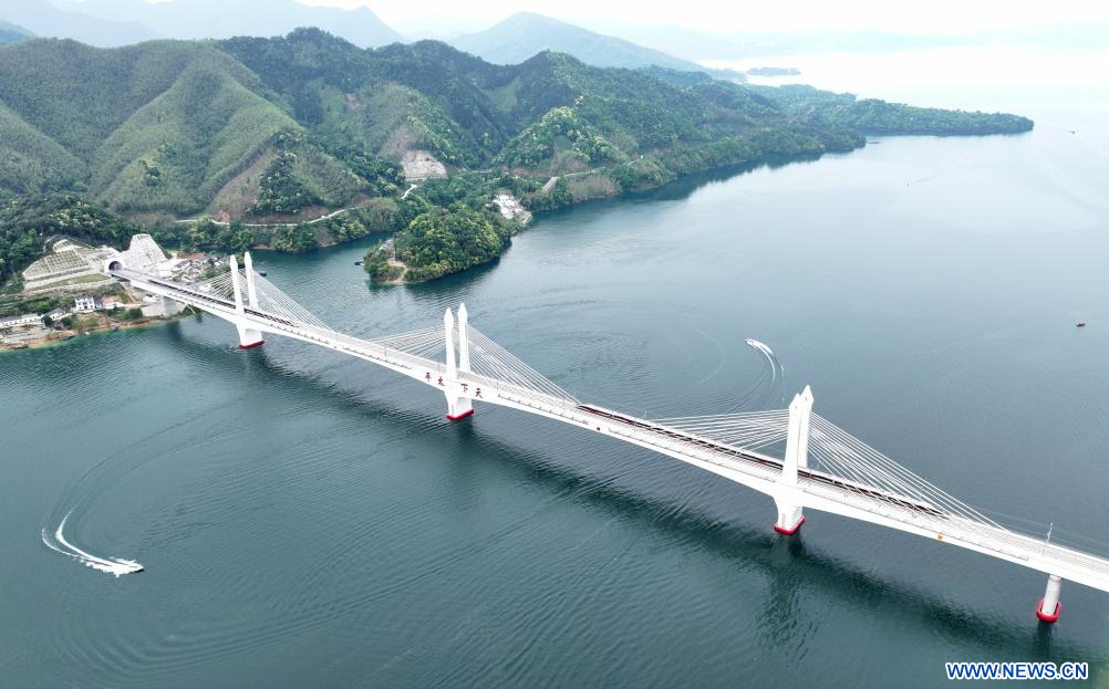 HEFEI, 26 abril, 2024 (Xinhua) -- Imagen aérea tomada con un dron de un tren circulando por el gran puente de Baishapu a lo largo del Ferrocarril Chizhou-Huangshan, en la provincia Anhui, en el este de China, el 26 de abril de 2024. El Ferrocarril Chizhou-Huangshan, que une la ciudad de Chizhou y la ciudad de Huangshan en la provincia de Anhui, en el este de China, comenzó a operar el viernes. Es una ruta turística que conecta la montaña Jiuhua, la montaña Huangshan, el lago Taiping y otras atracciones turísticas, lo cual es de gran importancia para promover el desarrollo económico y social a lo largo de la ruta. (Xinhua/Wang Jia)