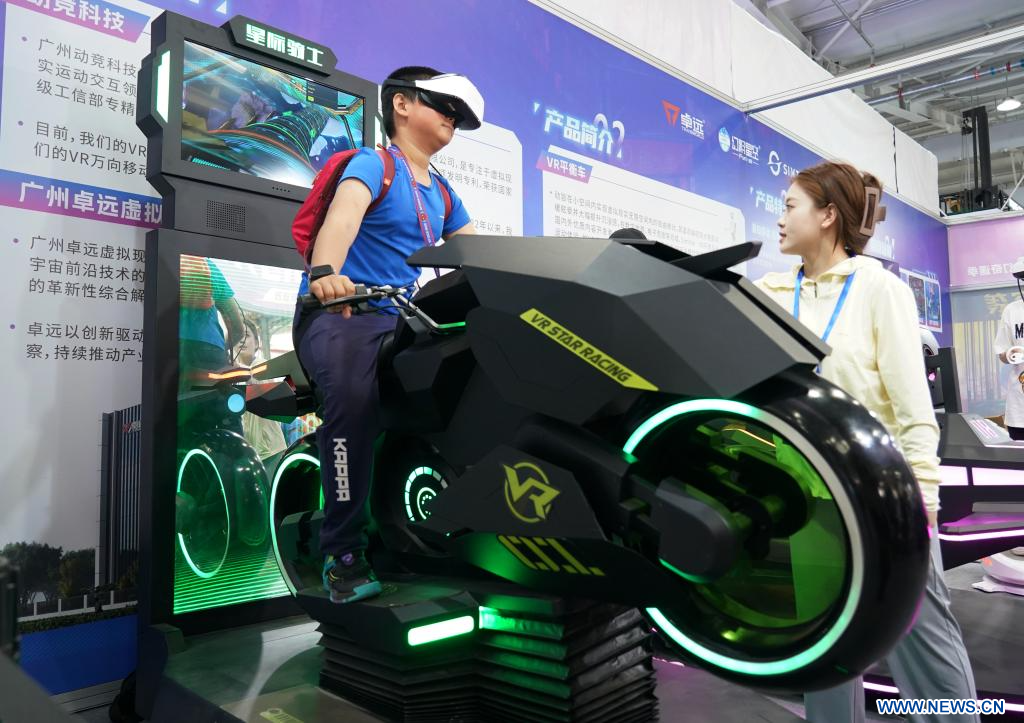 BEIJING, 27 abril, 2024 (Xinhua) -- Un niño juega un juego de Realidad Virtual en un carnaval de ciencia ficción junto con la Convención de Ciencia Ficción de China (CSFC, por sus siglas en inglés) 2024, en Beijing, capital de China, el 27 de abril de 2024. La CSFC 2024 comenzó el sábado en el parque de Shougang de Beijing, con una ceremonia de inauguración, foros, eventos promocionales de la industria y proyecciones de películas programadas. Un carnaval de ciencia ficción también se lleva a cabo durante la convención de este año. (Xinhua/Zhang Chenlin)