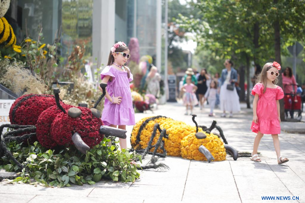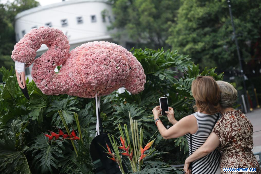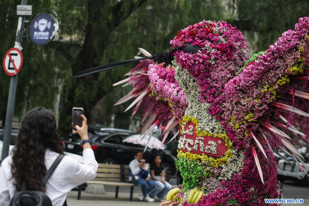 CIUDAD DE MEXICO, 27 abril, 2024 (Xinhua) -- Imagen del 26 de abril de 2024 de turistas tomando fotografías de una instalación decorada con flores durante el Festival Flores y Jardines, en la Ciudad de México, capital de México. (Xinhua/Francisco Cañedo)