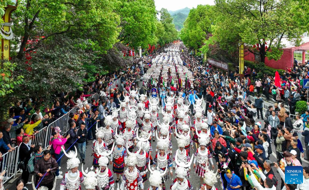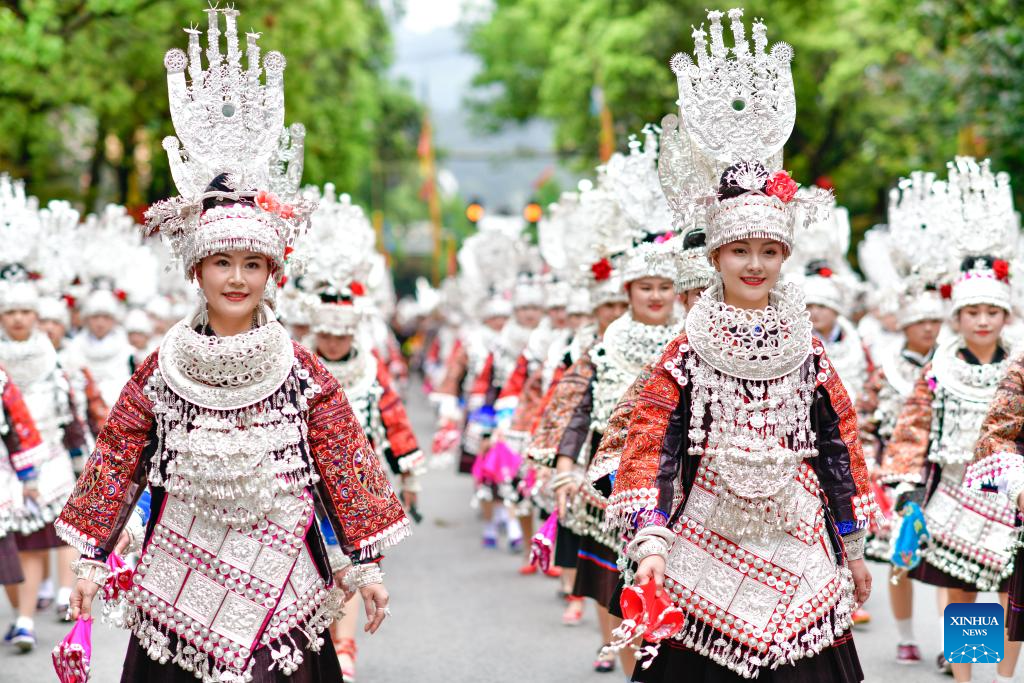 TAIJIANG, 21 abril, 2024 (Xinhua) -- Personas del grupo étnico miao asisten a un desfile para celebrar el Festival de las Hermanas Miao, en el distrito de Taijiang, en la provincia de Guizhou, en el suroeste de China, el 21 de abril de 2024. Reconocido como patrimonio cultural intangible nacional, el Festival de las Hermanas Miao comenzó aquí el sábado y durará hasta el 5 de mayo este año. (Xinhua/Yang Wenbin)