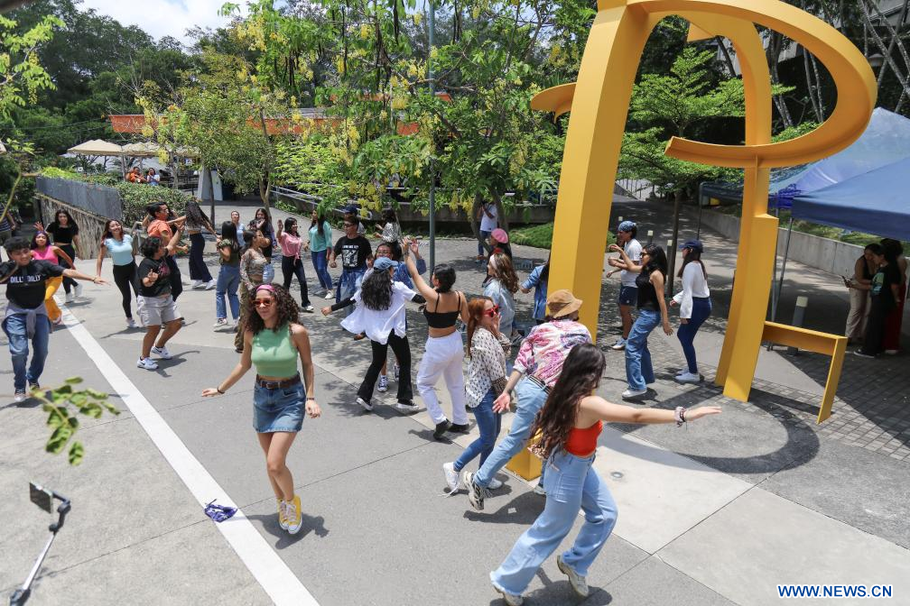 Bailarines y estudiantes participan en un "flashmob" durante la celebración del Día Internacional de la Danza, en las plazas de la Universidad Centroamericana de El Salvador (UCA), en el departamento de San Salvador, El Salvador, el 29 de abril de 2024. Decenas de bailarines y estudiantes de la UCA de la capital salvadoreña "tomaron" el lunes las plazas de la casa de estudios con una intervención artística o "flashmob" para celebrar el Día Internacional de la Danza y exaltar la fuerza expresiva de esta manifestación artística. (Xinhua/Alexander Peña)