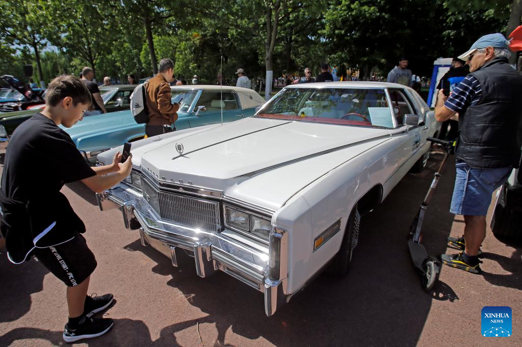 BUCAREST, 29 abril, 2024 (Xinhua) -- Imagen del 28 de abril de 2024 de visitantes observando un automóvil clásico de la marca Cadillac, durante el evento de automóviles históricos Desfile de Primavera Retro, en Bucarest, Rumania. Más de 200 automóviles clásicos en la exposición organizada por el Retromobil Club Romania. (Xinhua/Cristian Cristel)