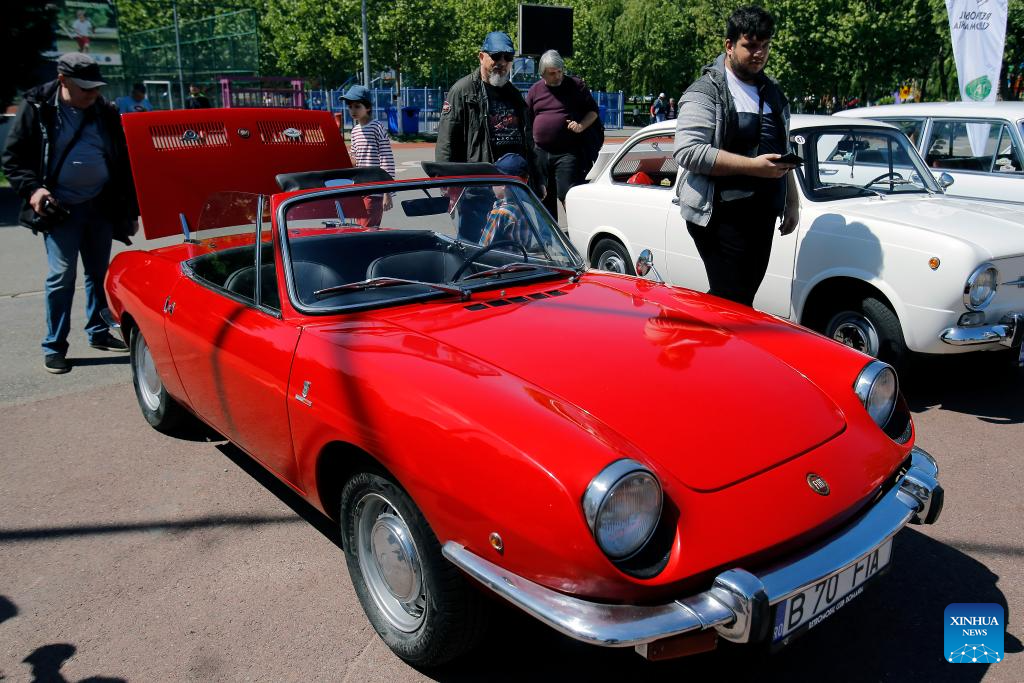 BUCAREST, 29 abril, 2024 (Xinhua) -- Imagen del 28 de abril de 2024 de visitantes observando un automóvil clásico de la marca Fiat, durante el evento de automóviles históricos Desfile de Primavera Retro, en Bucarest, Rumania. Más de 200 automóviles clásicos en la exposición organizada por el Retromobil Club Romania. (Xinhua/Cristian Cristel)
