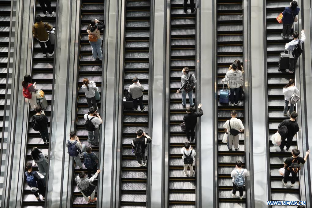 Pasajeros salen de la Estación de Ferrocarril del Oeste de Tianjin, en Tianjin, en el norte de China, el 1 de mayo de 2024. Las vacaciones por el Primero de Mayo en China duran del 1 al 5 de mayo de este año. La red ferroviaria del país experimentó un pico de viajes el primer día de las vacaciones. (Xinhua/Li Ran)