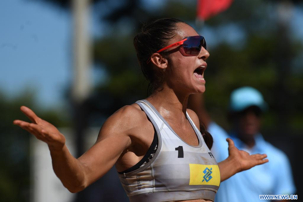 BRASILIA, 1 mayo, 2024 (Xinhua) -- Clemence Vieira, de Francia, reacciona durante el partido de clasificación femenina entre Clemence Vieira, y Aline Chamereau, de Francia, y Heather Bansley, y Sophie Bukovec, de Canadá, en el Elite 16 del Volleyball World Beach Pro Tour 2024, en Brasilia, Brasil, el 1 de mayo de 2024. (Xinhua/Lucio Tavora)