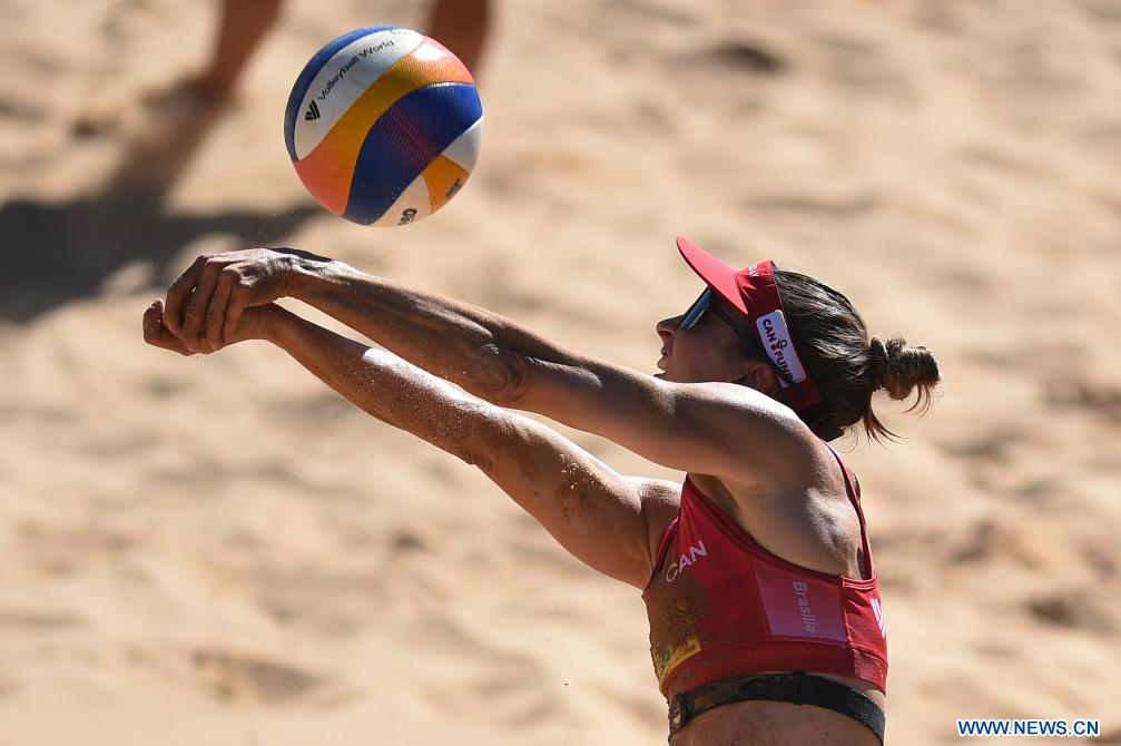 BRASILIA, 1 mayo, 2024 (Xinhua) -- Heather Bansley, de Canadá, pasa el balón durante el partido de clasificación femenina entre Clemence Vieira, y Aline Chamereau, de Francia, y Heather Bansley, y Sophie Bukovec, de Canadá, en el Elite 16 del Volleyball World Beach Pro Tour 2024, en Brasilia, Brasil, el 1 de mayo de 2024. (Xinhua/Lucio Tavora)