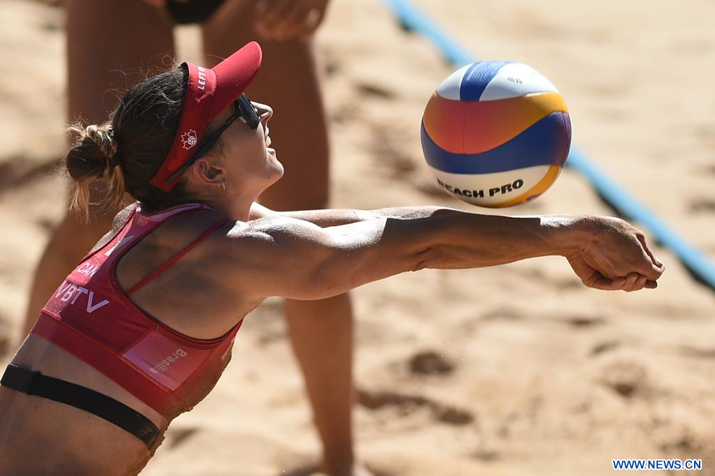 BRASILIA, 1 mayo, 2024 (Xinhua) -- Sophie Bukovec, de Canadá, remata el balón durante el partido de clasificación femenina entre Clemence Vieira, y Aline Chamereau, de Francia, y Heather Bansley, y Sophie Bukovec, de Canadá, en el Elite 16 del Volleyball World Beach Pro Tour 2024, en Brasilia, Brasil, el 1 de mayo de 2024. (Xinhua/Lucio Tavora)