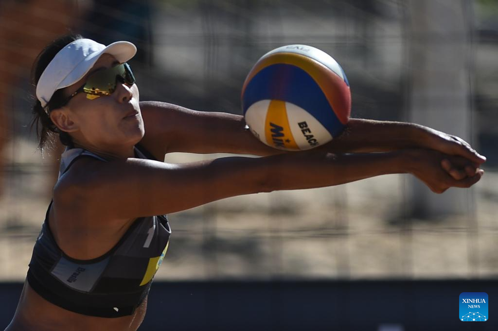 BRASILIA, 3 mayo, 2024 (Xinhua) -- Chen Xue, de China, recibe el balón durante el partido de clasificación femenina entre Sara Hughes y Kelly Cheng, de Estados Unidos, y Chen Xue y Xia Xinyi, de China, en el Elite 16 del Volleyball World Beach Pro Tour 2024, en Brasilia, Brasil, el 3 de mayo de 2024. (Xinhua/Lucio Tavora)