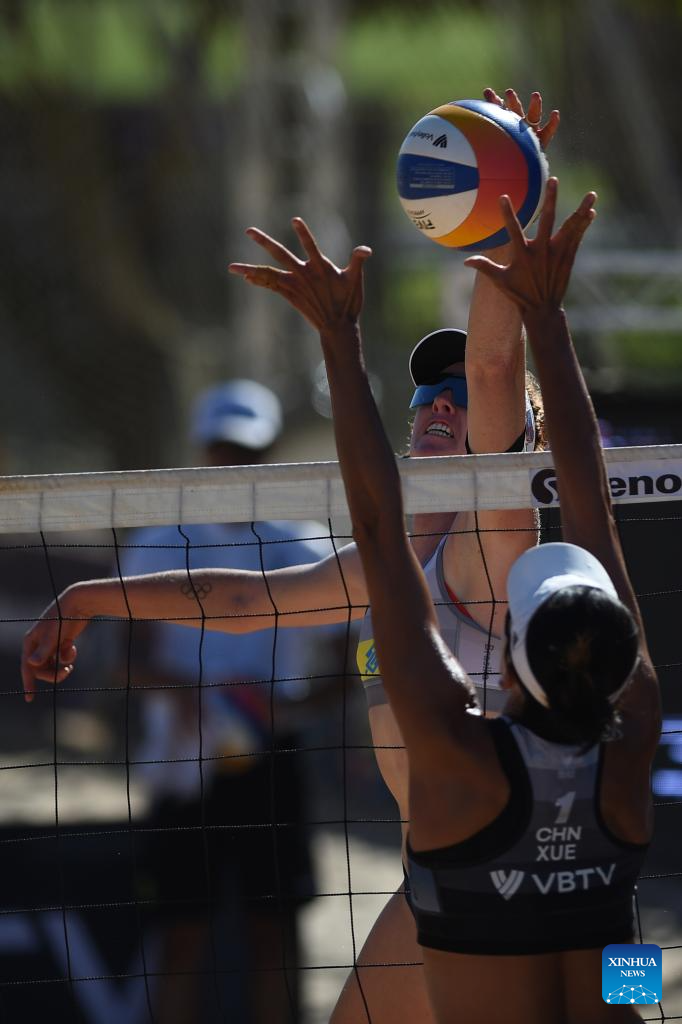 BRASILIA, 3 mayo, 2024 (Xinhua) -- Kelly Cheng, de Estados Unidos (atrás), remate el balón durante el partido de clasificación femenina entre Sara Hughes y Kelly Cheng, de Estados Unidos, y Chen Xue y Xia Xinyi, de China, en el Elite 16 del Volleyball World Beach Pro Tour 2024, en Brasilia, Brasil, el 3 de mayo de 2024. (Xinhua/Lucio Tavora)