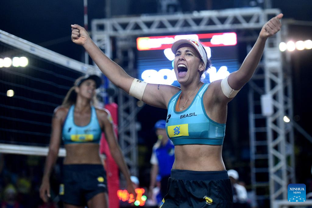 BRASILIA, 6 mayo, 2024 (Xinhua) -- Imagen del 5 de mayo de 2024 de Eduarda Santos Lisboa, festejando durante el partido final femenino entre Ana Patricia Silva Ramos y Eduarda Santos Lisboa, de Brasil y Kristen Nuss y Traryn Kloth, de Estados Unidos en el Elite 16 del Volleyball World Beach Pro Tour 2024, en Brasilia, Brasil. (Xinhua/Lucio Tavora)