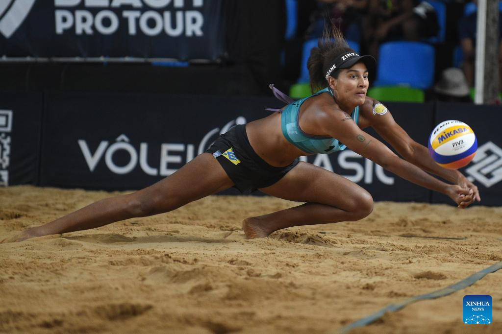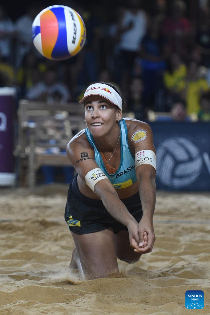 BRASILIA, 6 mayo, 2024 (Xinhua) -- Imagen del 5 de mayo de 2024 de Eduarda Santos Lisboa, compitiendo durante el partido final femenino entre Ana Patricia Silva Ramos y Eduarda Santos Lisboa, de Brasil y Kristen Nuss y Traryn Kloth, de Estados Unidos en el Elite 16 del Volleyball World Beach Pro Tour 2024, en Brasilia, Brasil. (Xinhua/Lucio Tavora)