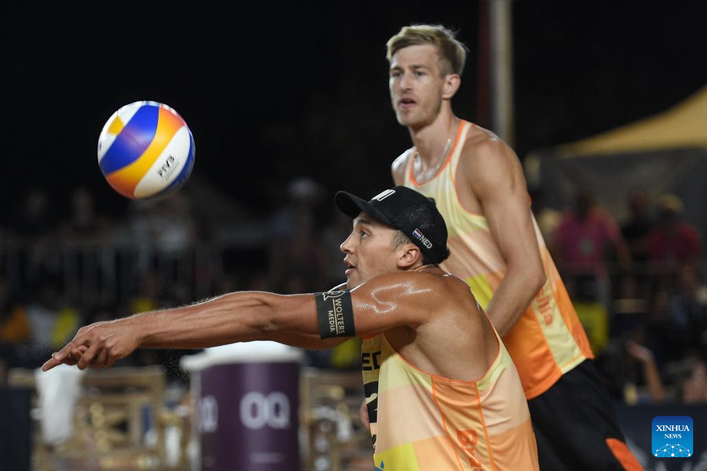 BRASILIA, 6 mayo, 2024 (Xinhua) -- Imagen del 5 de mayo de 2024 de Steven Van De Velde y Matthew Immers (i), compitiendo durante el partido final masculino entre Evandro Goncalves Oliveira Junior y Arthur Diego Mariano Lanci, de Brasil y Steven Van De Velde y Matthew Immers, de Países Bajos en el Elite 16 del Volleyball World Beach Pro Tour 2024, en Brasilia, Brasil. (Xinhua/Lucio Tavora)