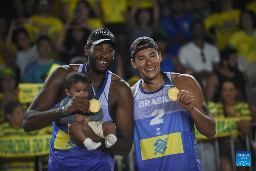 BRASILIA, 6 mayo, 2024 (Xinhua) -- Imagen del 5 de mayo de 2024 de los medallistas de oro, Evandro Goncalves Oliveira Junior y Arthur Diego Mariano Lanci (d), de Brasil, posando con sus medallas durante la ceremonia de premiación después del partido final masculino en el Elite 16 del Volleyball World Beach Pro Tour 2024, en Brasilia, Brasil. (Xinhua/Lucio Tavora)