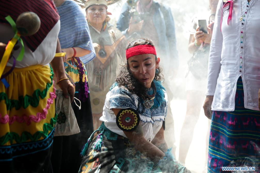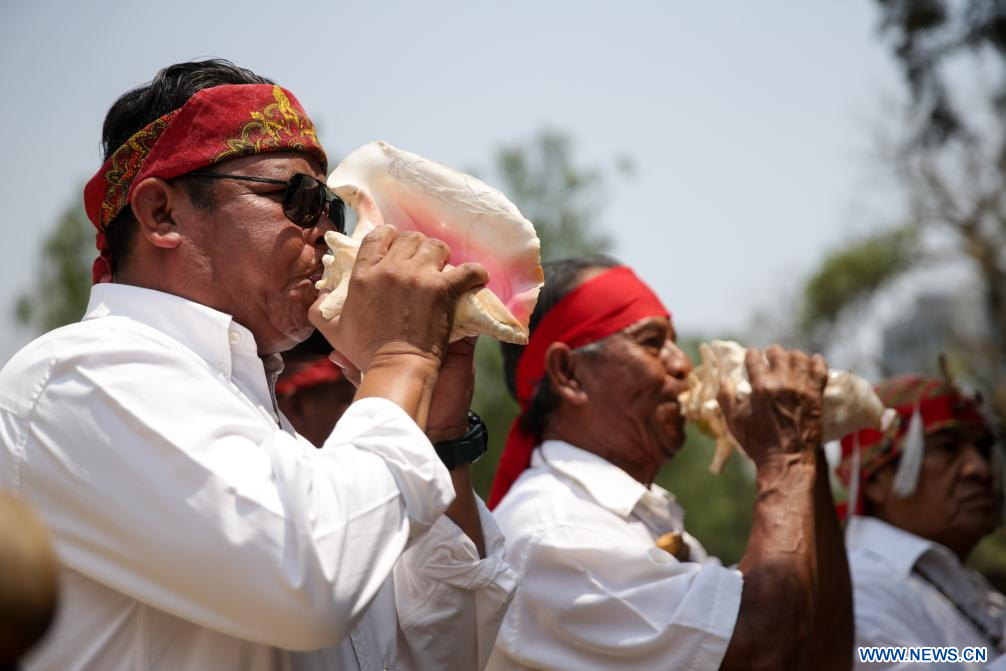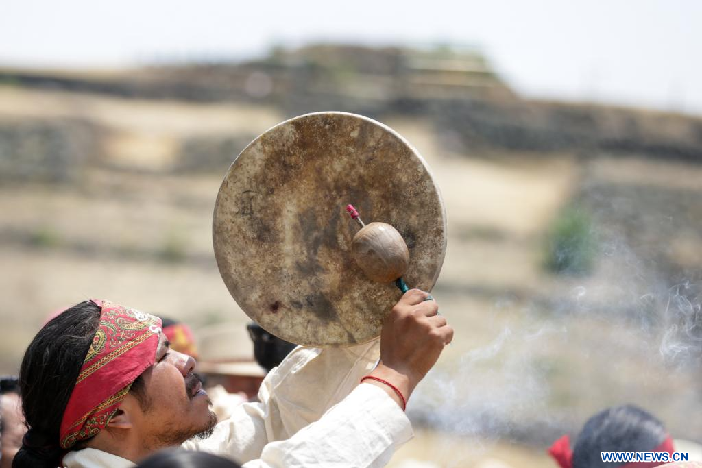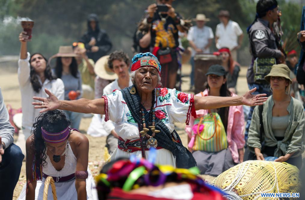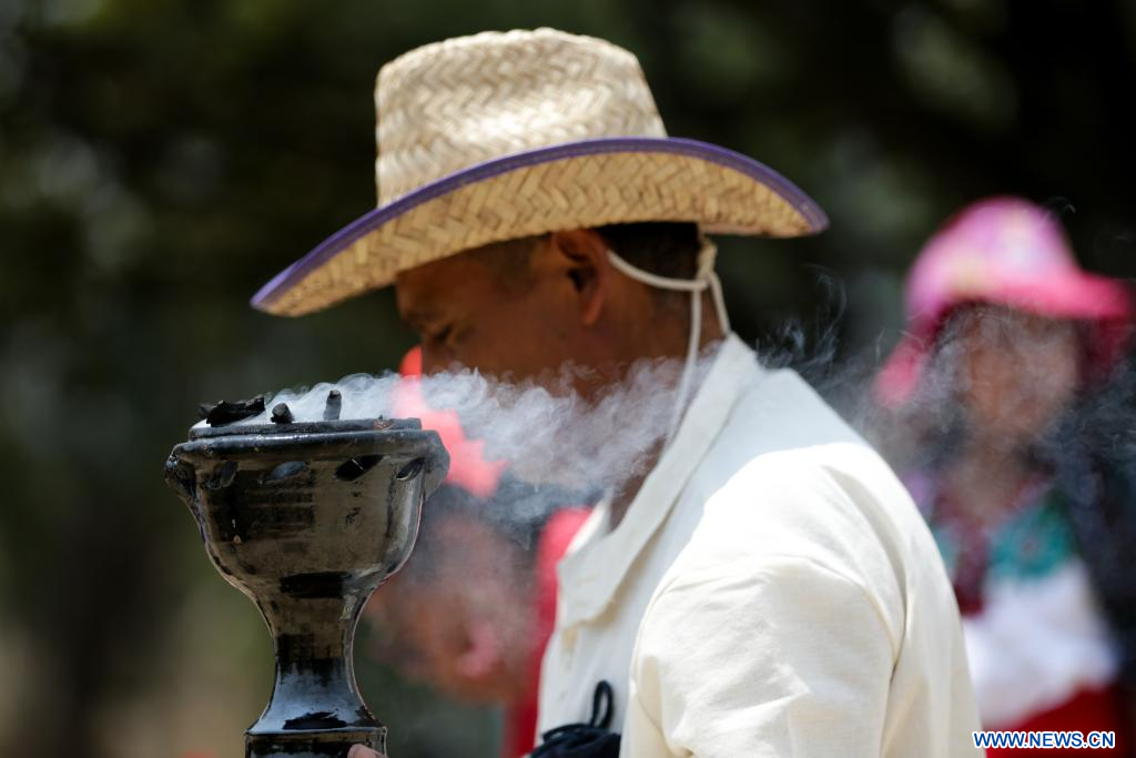 CIUDAD DE MÉXICO, 4 mayo, 2024 (Xinhua) -- Imagen del 3 de mayo de 2024 de personas participando en una ceremonia de petición de lluvia en la zona arqueológica de Cuicuilco, en la Ciudad de México, capital de México. (Xinhua/Francisco Cañedo)