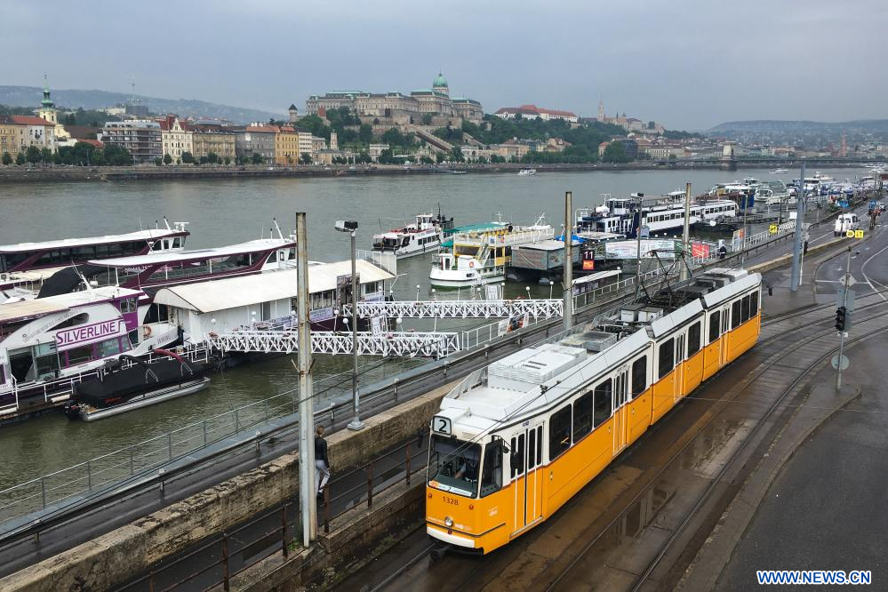 BUDAPEST, 2 mayo, 2024 (Xinhua) -- Imagen del 19 de mayo de 2021 de un tranvía transitando frente a un muelle del río Danubio, en Budapest, Hungría. (Xinhua/Zheng Huansong)