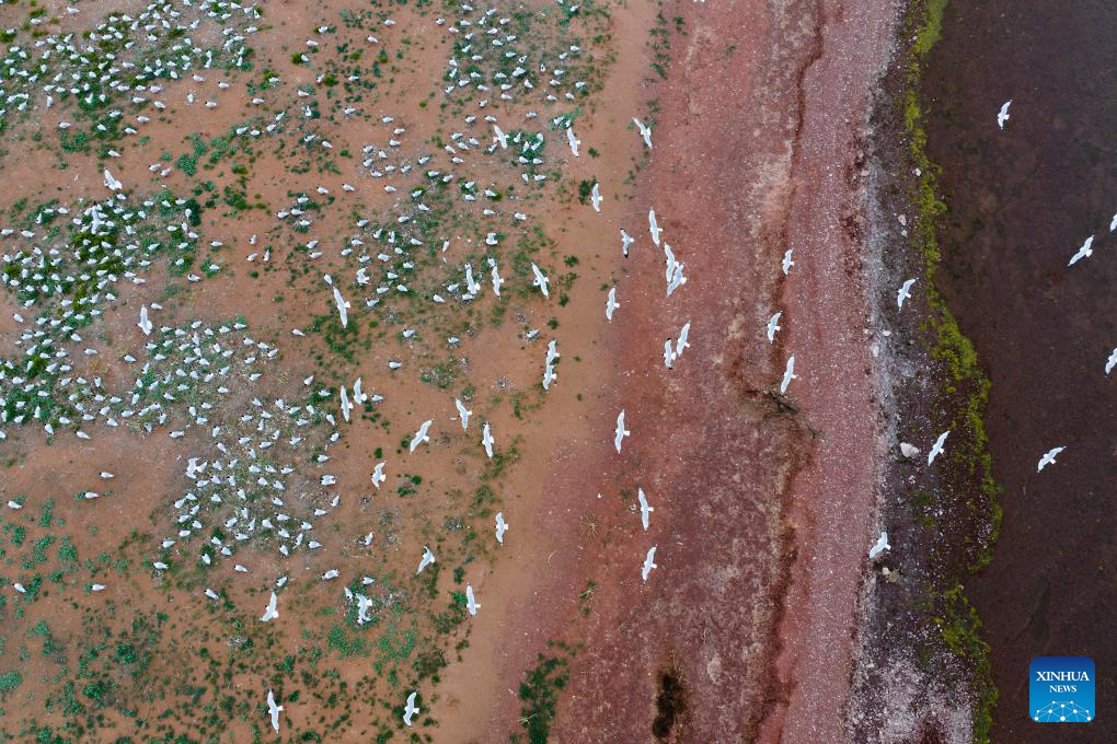 XI'AN, 5 junio, 2024 (Xinhua) -- Vista aérea tomada con un dron el 4 de junio de 2024 de gaviotas relictas en la Reserva Natural Nacional de Hongjiannao, en Shenmu, en la provincia de Shaanxi, en el noroeste de China. En la actualidad, casi 5.000 nidos de gaviotas relictas han entrado en el período de incubación y crianza en el lago Hongjiannao, el mayor lago desértico de agua dulce de China. Después de años de tratamiento, el lago ha recuperado vitalidad y se ha convertido en un importante hábitat y lugar de cría para la gaviota relicta, que se encuentra bajo protección nacional de primera clase en China. (Xinhua/Shao Rui)