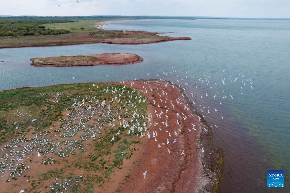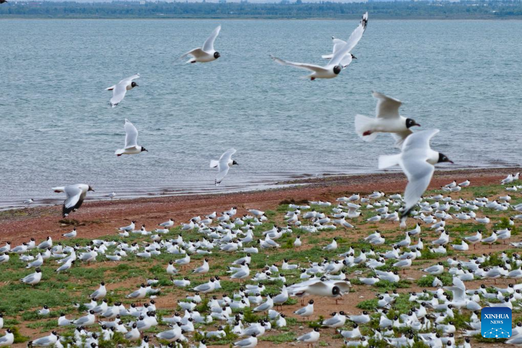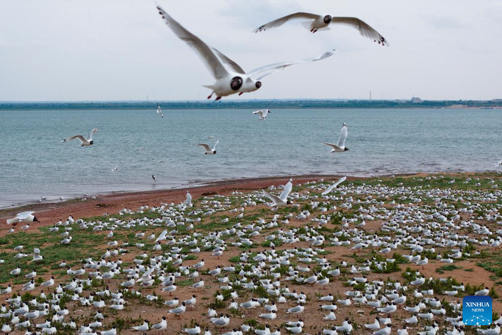 XI'AN, 5 junio, 2024 (Xinhua) -- Imagen tomada con un dron el 4 de junio de 2024 de gaviotas relictas en la Reserva Natural Nacional de Hongjiannao, en Shenmu, en la provincia de Shaanxi, en el noroeste de China. En la actualidad, casi 5.000 nidos de gaviotas relictas han entrado en el período de incubación y crianza en el lago Hongjiannao, el mayor lago desértico de agua dulce de China. Después de años de tratamiento, el lago ha recuperado vitalidad y se ha convertido en un importante hábitat y lugar de cría para la gaviota relicta, que se encuentra bajo protección nacional de primera clase en China. (Xinhua/Shao Rui)