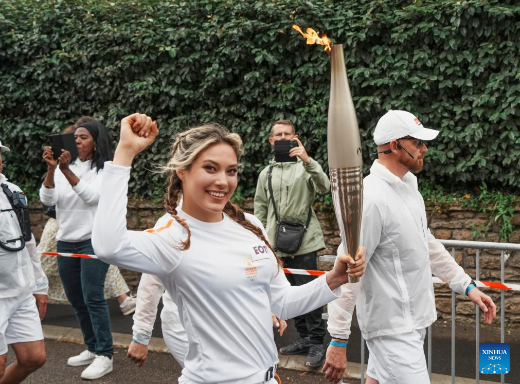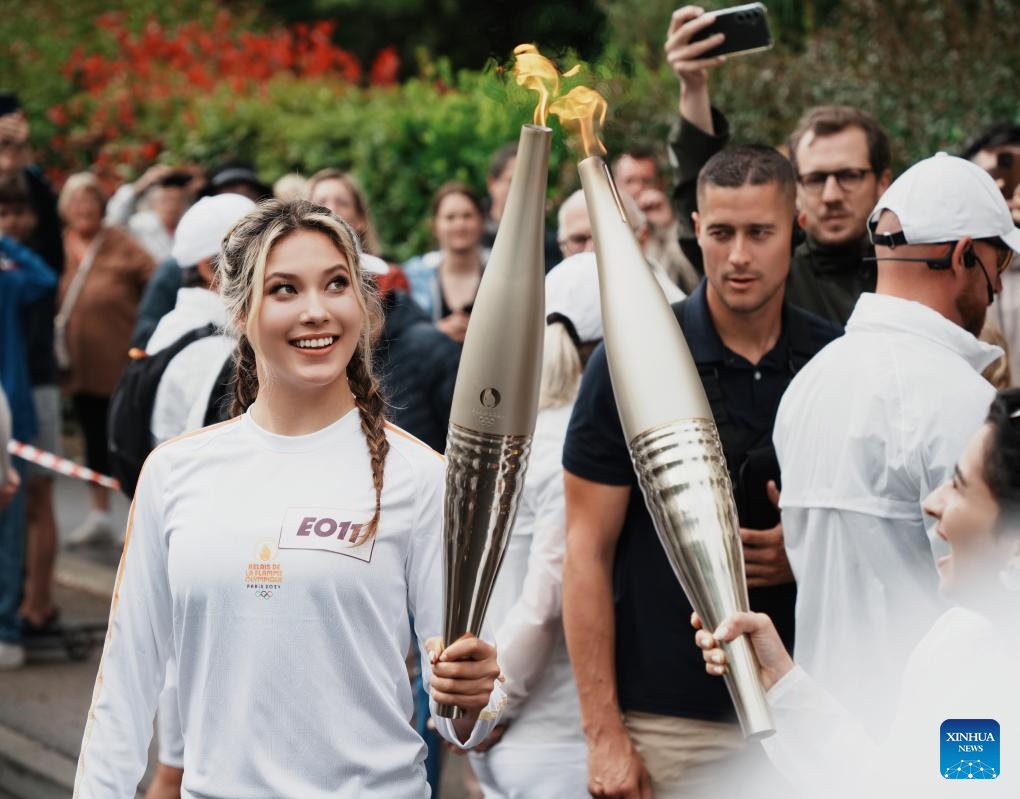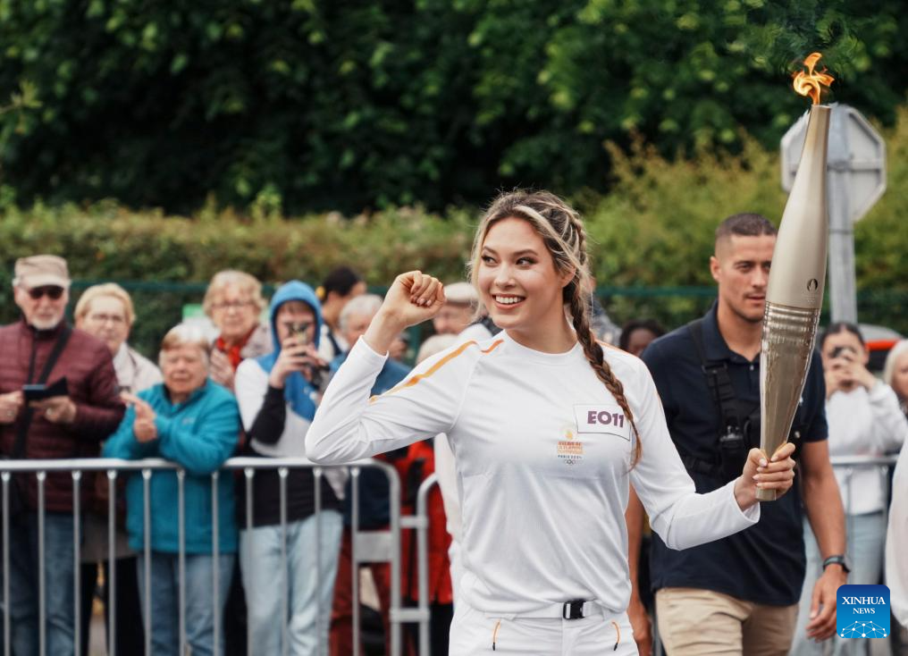 LOIRE, 5 junio, 2024 (Xinhua) -- La campeona olímpica de invierno, Gu Ailing, pasa la antorcha olímpica de París 2024 durante el relevo de la llama olímpica de París 2024, en Loire, Francia, el 5 de junio de 2024. (Xinhua/Xiao Yazhuo)