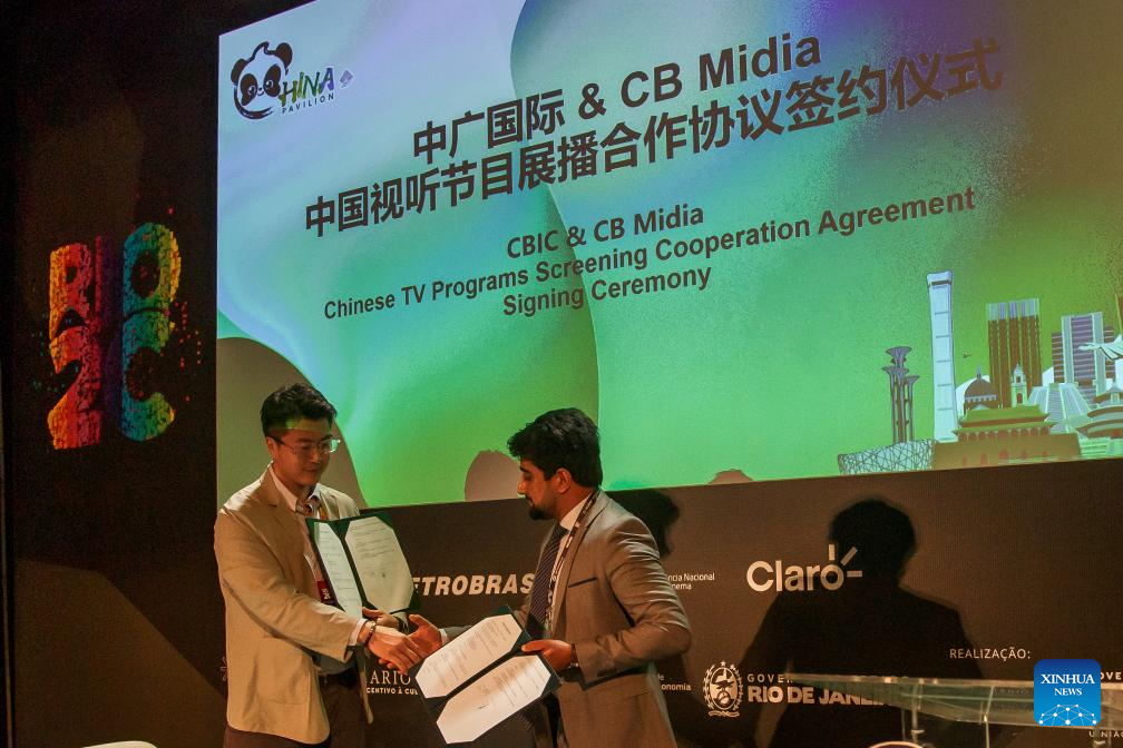 RIO DE JANEIRO, 6 junio, 2024 (Xinhua) -- Feng Bo (i), subdirector del departamento de intercambios internacionales de CBIC y Ahmad Afzal (d), director de CB Midia, participan en la ceremonia de firma del Acuerdo de Cooperación de Proyección de Programas de la Televisión china, en el Foro "Viendo a China-Cultura y Posibilidades de Negocio" en la RIO2C 2024 (Conferencia Creativa de Río) llevada a cabo en la Ciudad de las Artes, en Río de Janeiro, Brasil, el 6 de junio de 2024. (Xinhua/Claudia Martini)