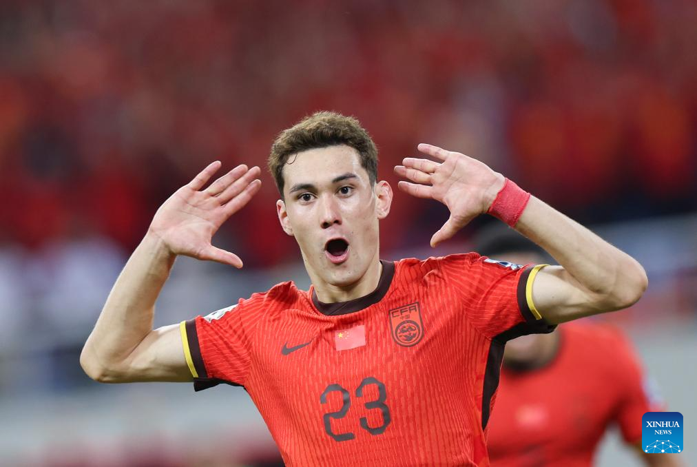 SHENYANG, 6 junio, 2024 (Xinhua) -- El jugador Behram Abduweli, de China, festeja su anotación durante el partido correspondiente al Grupo C de las Eliminatorias de Asia para la Copa Mundial de la FIFA 2026, entre China y Tailandia, en Shenyang, en la provincia de Liaoning, en el noreste de China, el 6 de junio de 2024. (Xinhua/Li Gang)