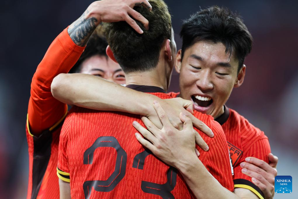 SHENYANG, 6 junio, 2024 (Xinhua) -- El jugador Behram Abduweli (c), de China, festeja su anotación junto a su compañero Zhu Chenjie (d), durante el partido correspondiente al Grupo C de las Eliminatorias de Asia para la Copa Mundial de la FIFA 2026, entre China y Tailandia, en Shenyang, en la provincia de Liaoning, en el noreste de China, el 6 de junio de 2024. (Xinhua/Li Gang)