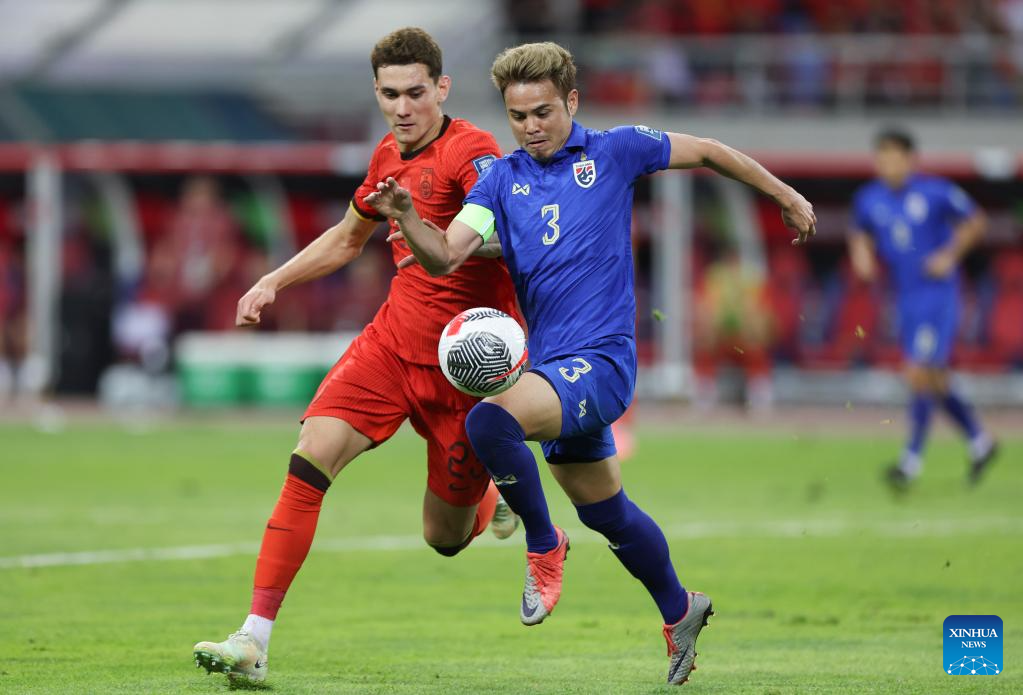 SHENYANG, 6 junio, 2024 (Xinhua) -- El jugador A Lan (d), de China, disputa el balón con Suphanan Bureerat, de Tailandia, durante el partido correspondiente al Grupo C de las Eliminatorias de Asia para la Copa Mundial de la FIFA 2026, entre China y Tailandia, en Shenyang, en la provincia de Liaoning, en el noreste de China, el 6 de junio de 2024. (Xinhua/Zhang Chen)