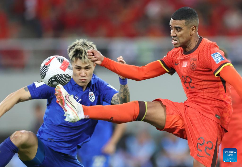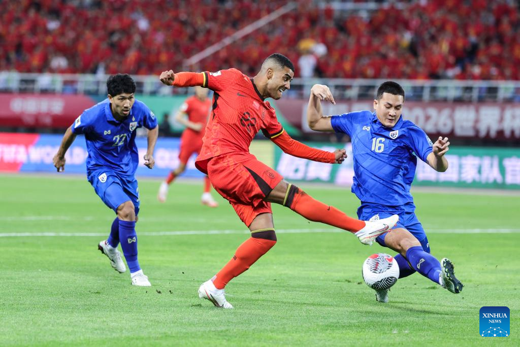 SHENYANG, 6 junio, 2024 (Xinhua) -- El jugador A Lan (c), de China, disputa el balón con Suphan Thongsong, de Tailandia, durante el partido correspondiente al Grupo C de las Eliminatorias de Asia para la Copa Mundial de la FIFA 2026, entre China y Tailandia, en Shenyang, en la provincia de Liaoning, en el noreste de China, el 6 de junio de 2024. (Xinhua/Pan Yulong)