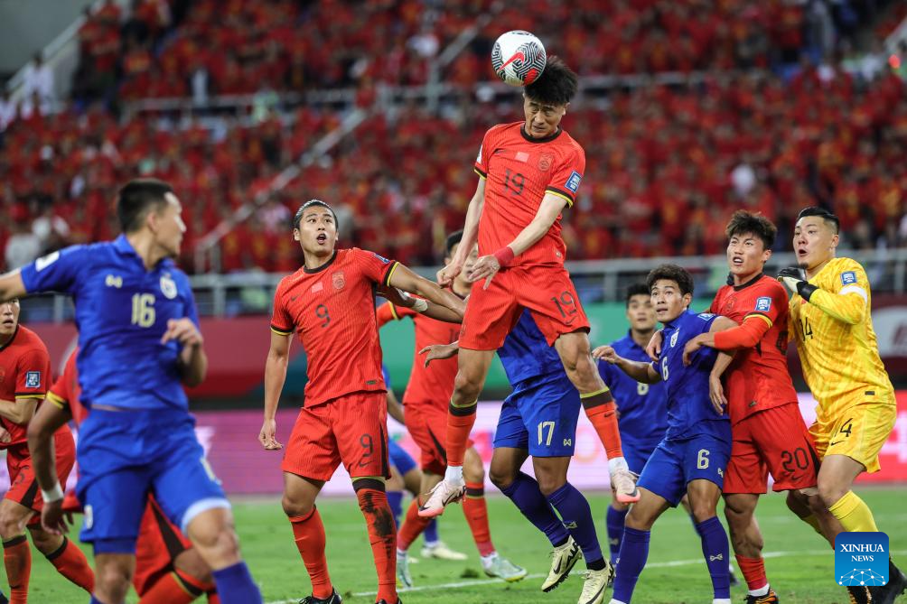SHENYANG, 6 junio, 2024 (Xinhua) -- Liu Yang (arriba), de China, cabecea el balón durante el partido correspondiente al Grupo C de las Eliminatorias de Asia para la Copa Mundial de la FIFA 2026, entre China y Tailandia, en Shenyang, en la provincia de Liaoning, en el noreste de China, el 6 de junio de 2024. (Xinhua/Pan Yulong)