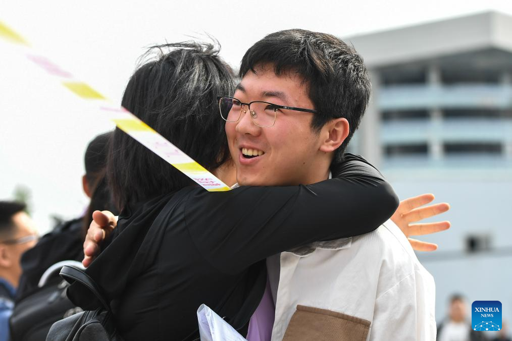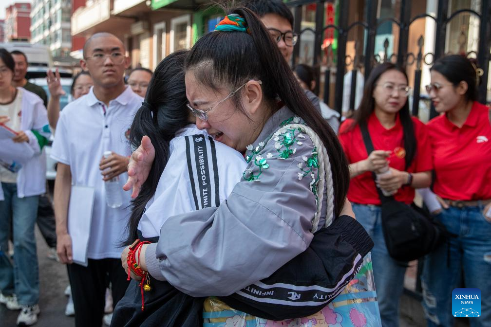 HARBIN, 7 junio, 2024 (Xinhua) -- Una aspirante (i) abraza a una profesora afuera de un sitio del examen nacional de ingreso a la universidad, en Harbin, en la provincia de Heilongjiang, en el noreste de China, el 7 de junio de 2024. El examen nacional de ingreso a la universidad de China, conocido como Gaokao, comenzó el viernes. (Xinhua/Zhang Tao)